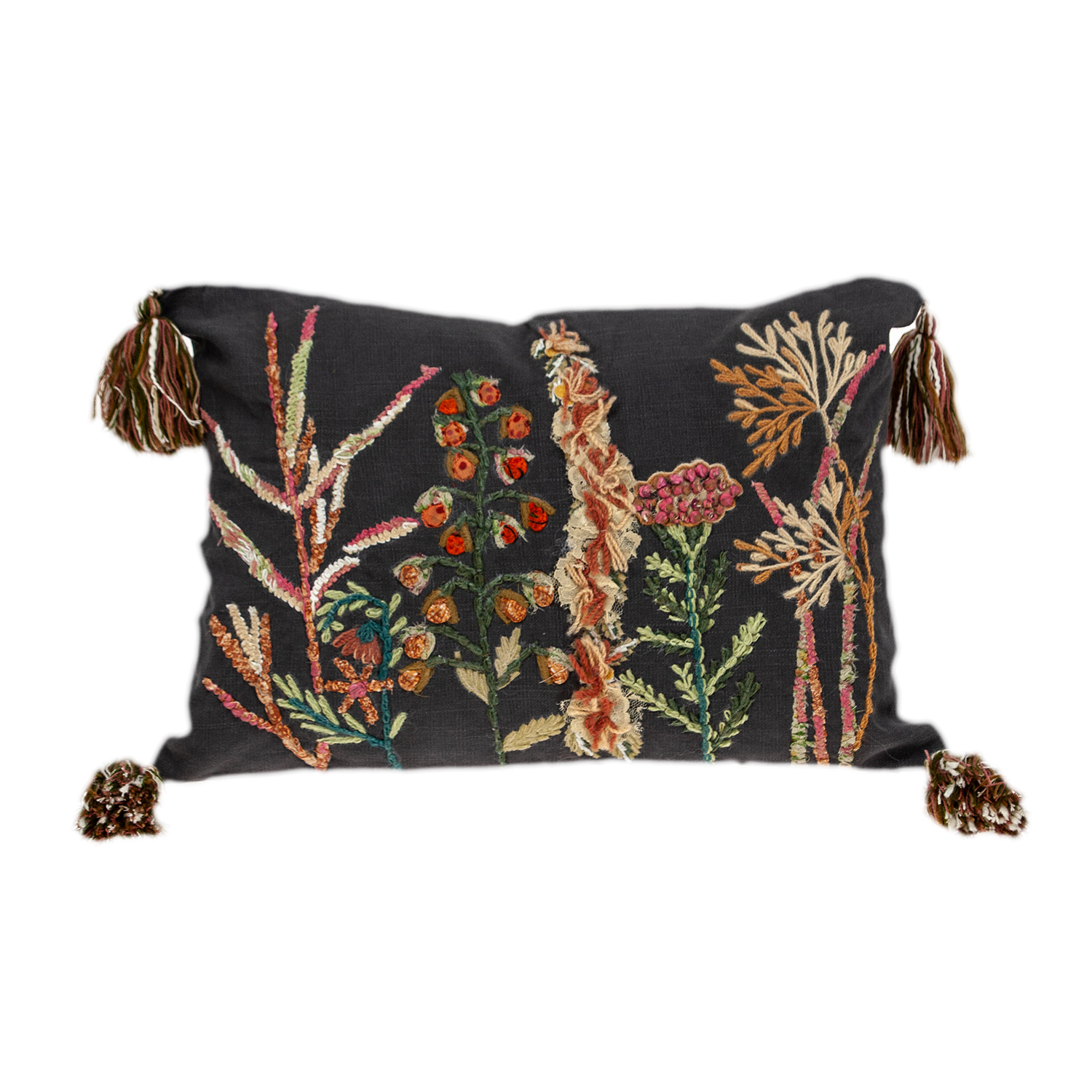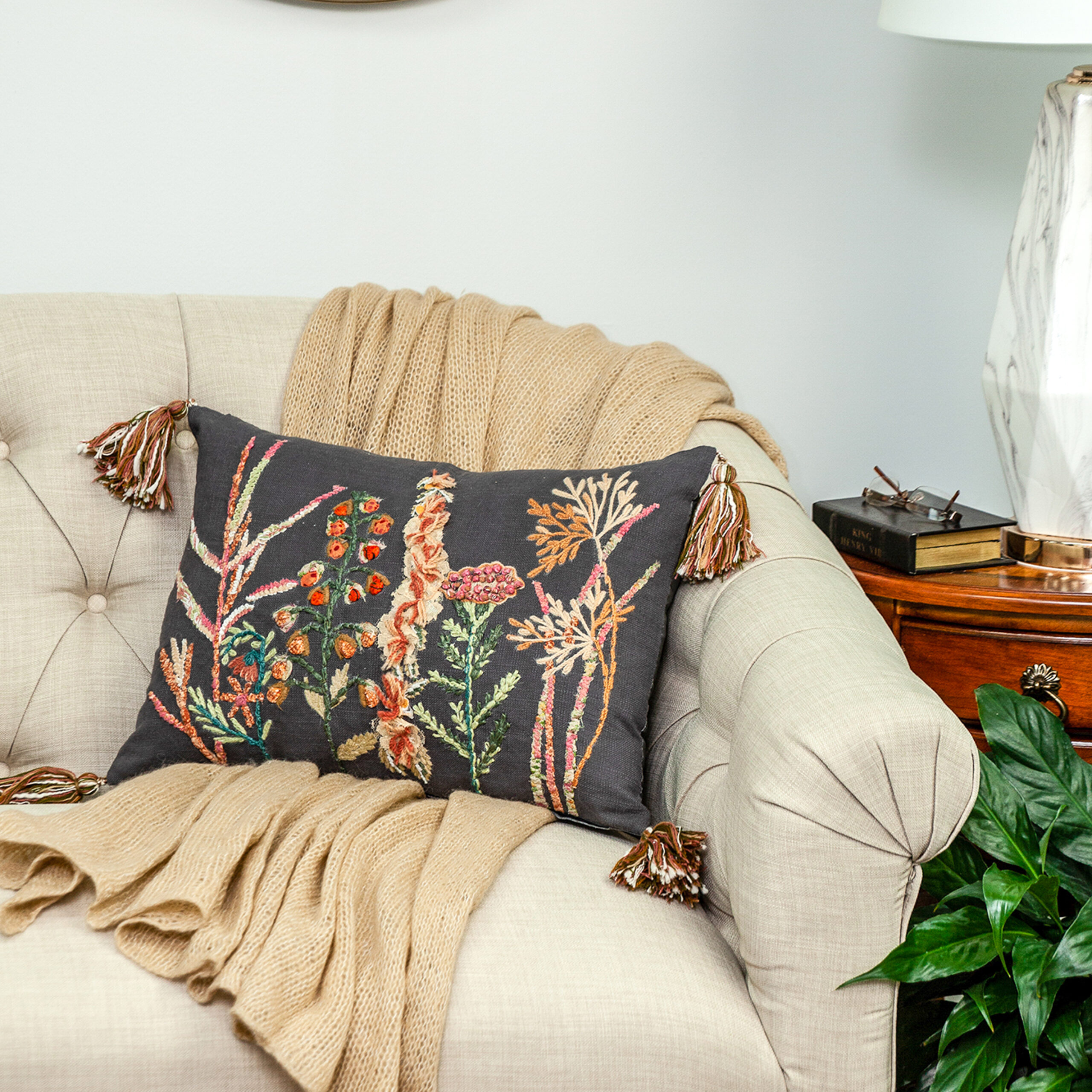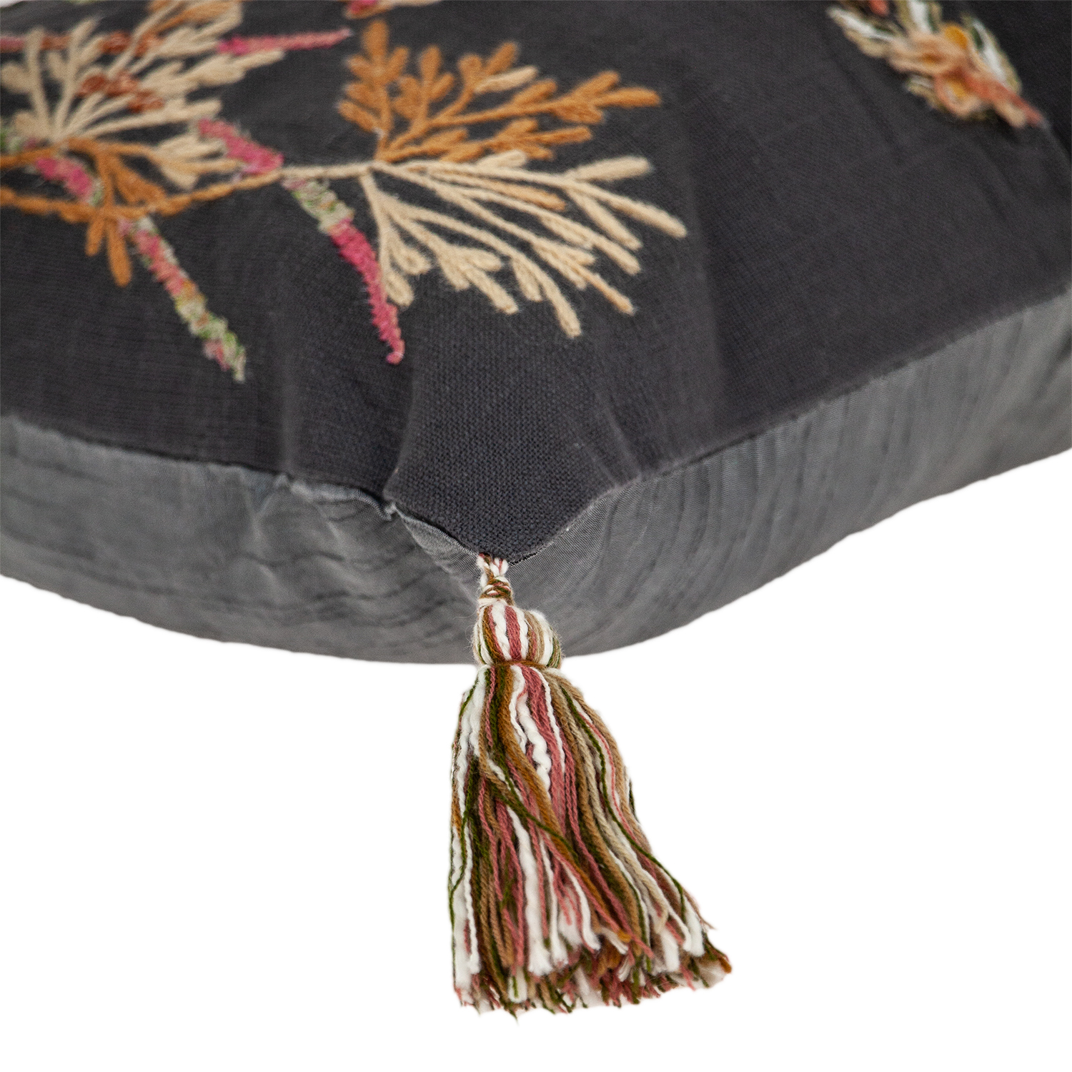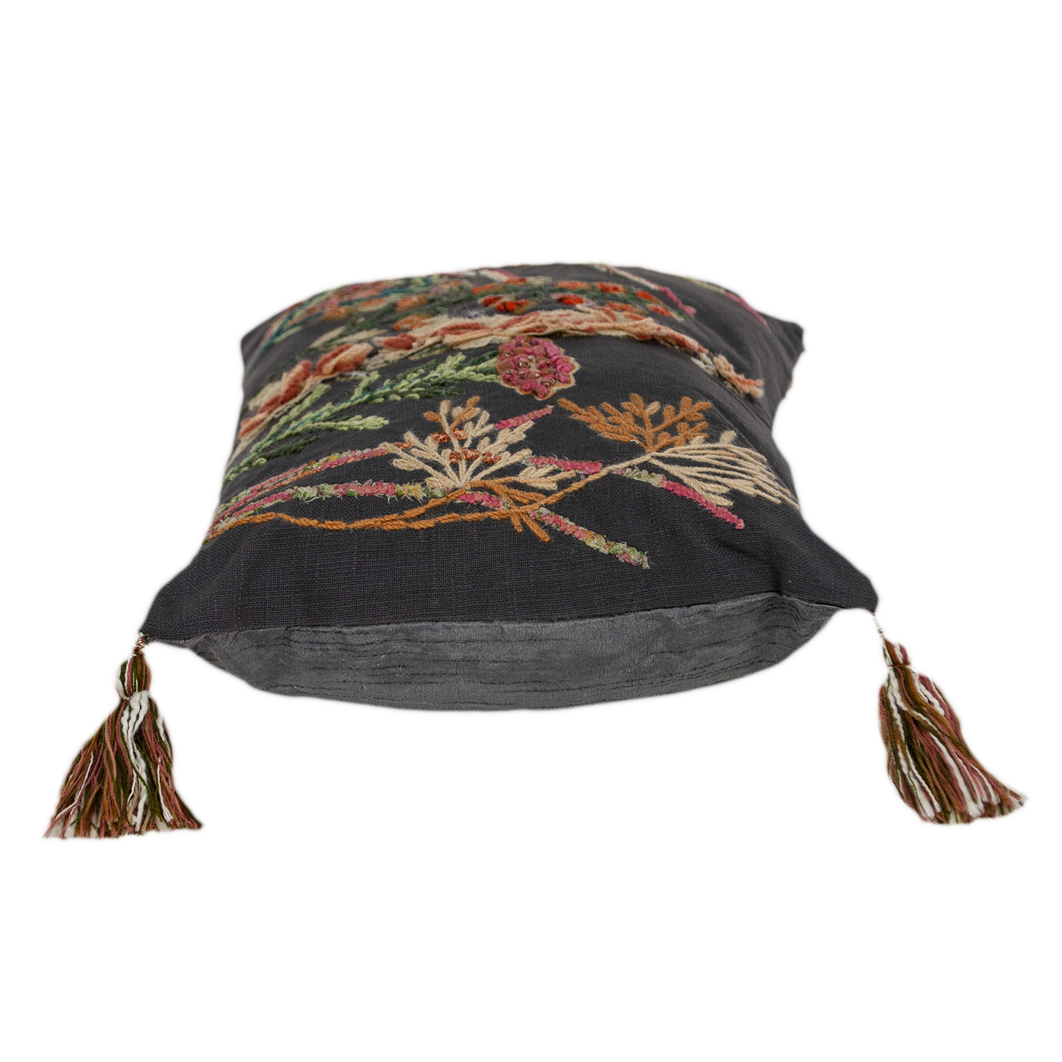 Enjoy this Accent Throw Pillow from Parkland Collection. Embroidered with a multicolor floral motif on a Gray TEXTURED FABRIC, this pillow is sure to add a pop of color and style to any setting. Features include TEXTURED FABRIC, intricate details and plump tassels on each corner.