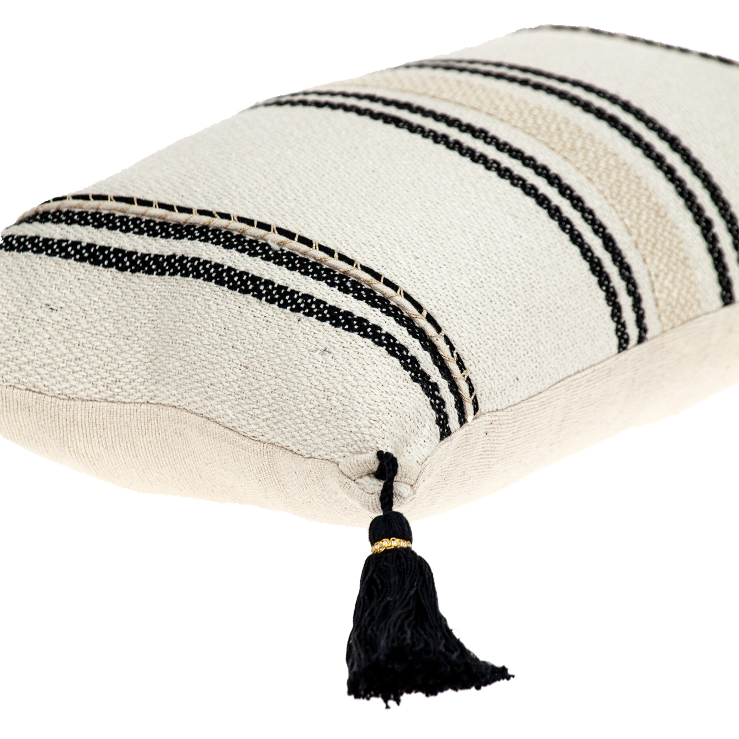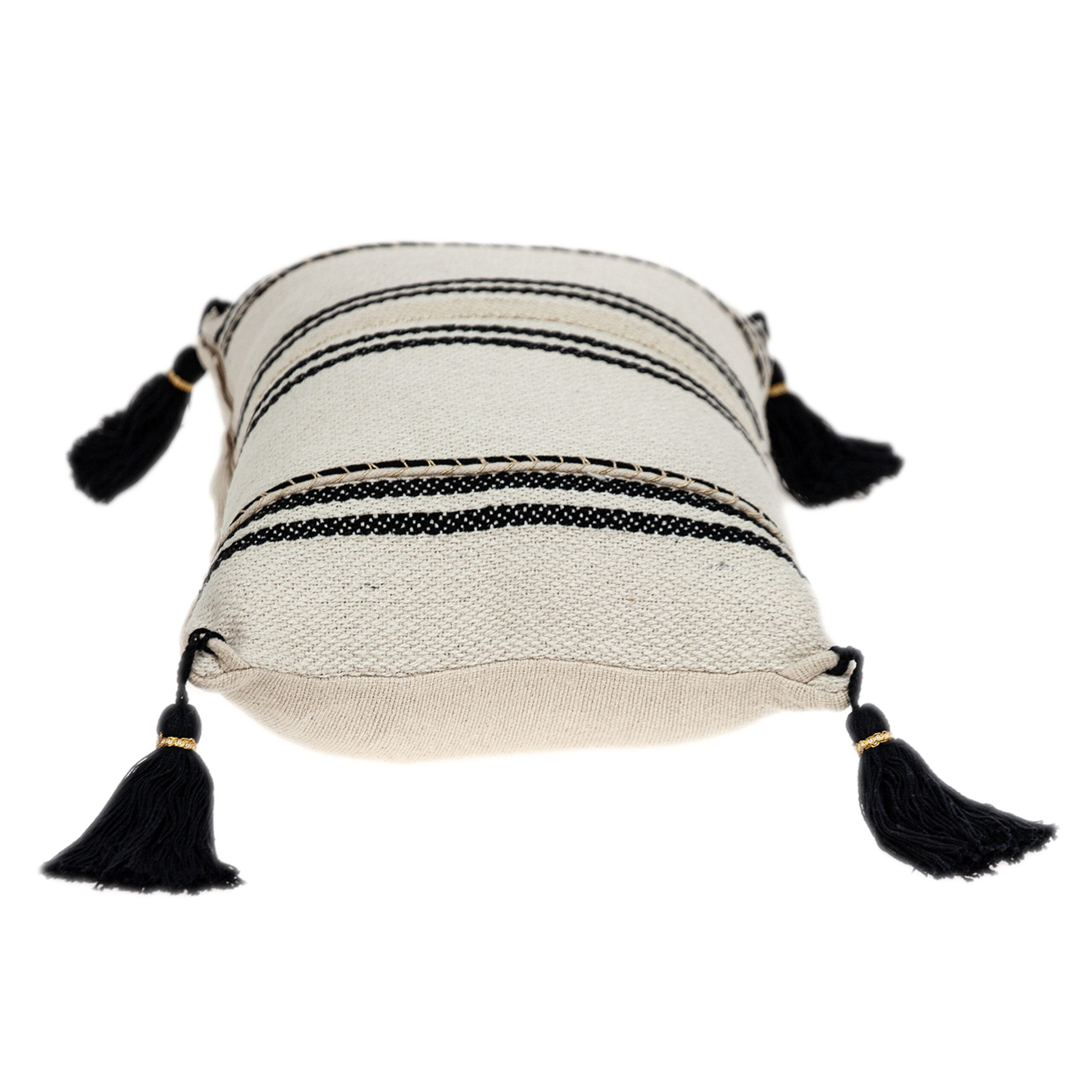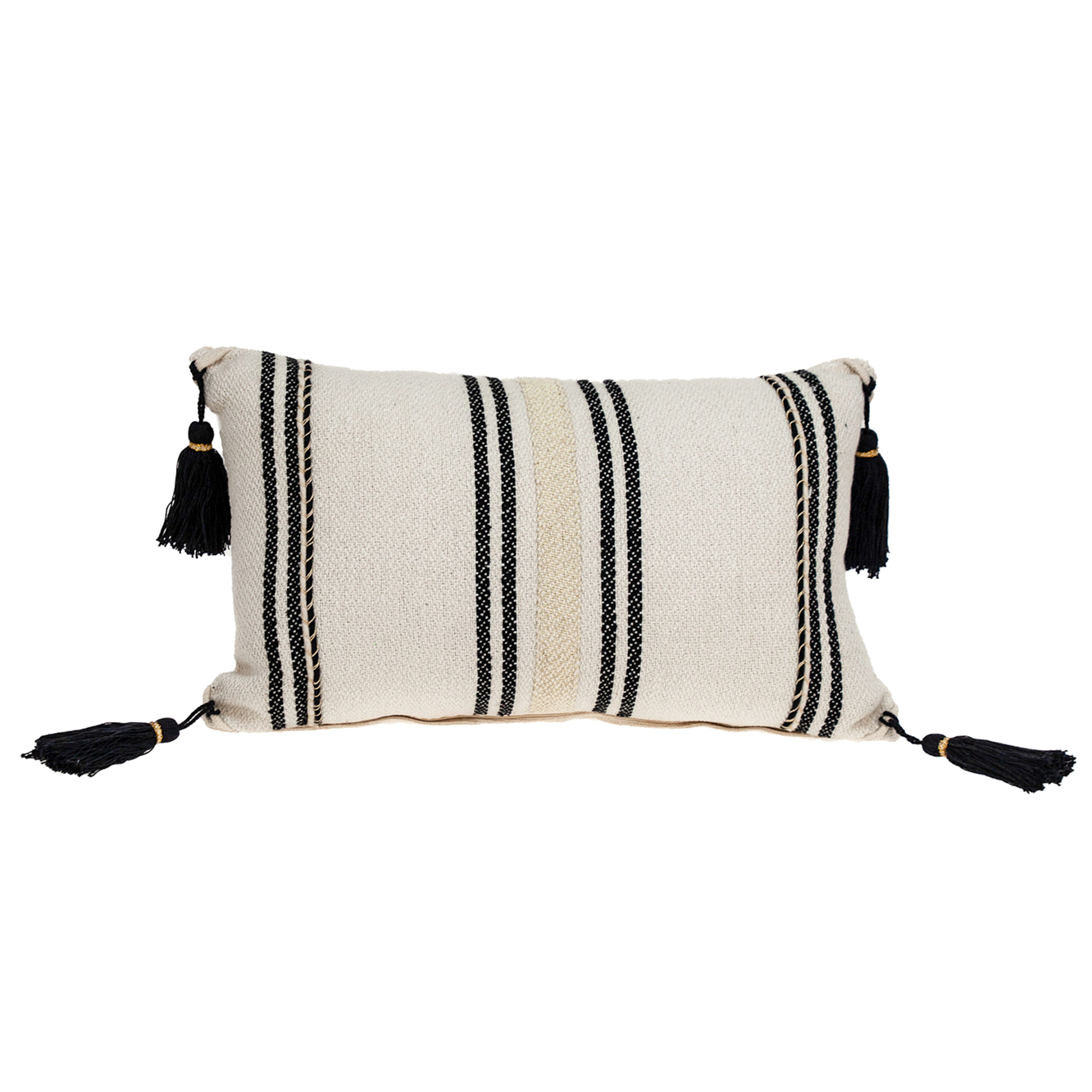 InsBeigetly transform any room into a luxurious space with this affordable Piece. It has Gold stitchband in the middle on its front side and 4 tassels on each corner is made of 100% Black Cotton. Feel luxurious and comfortable adding this pillow.