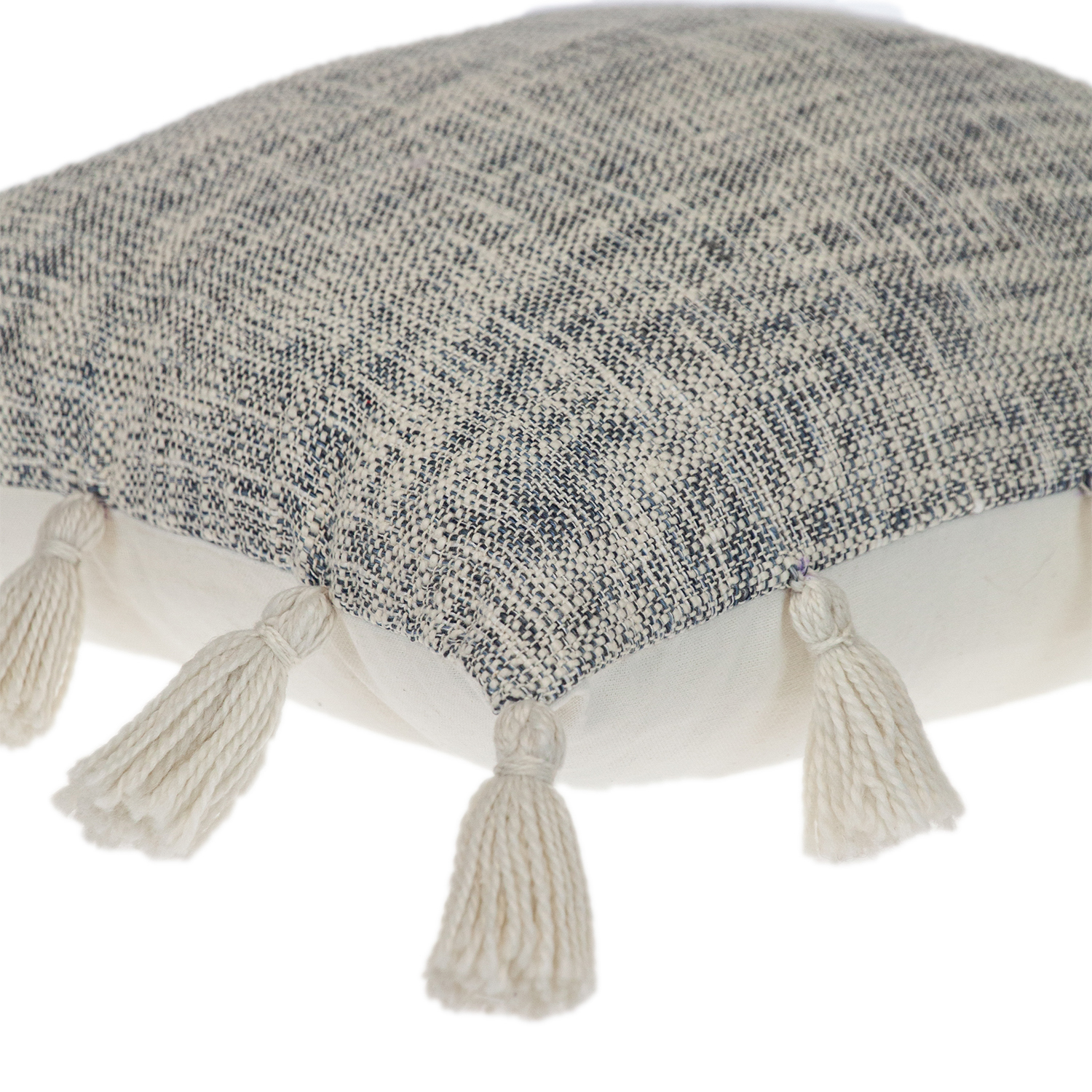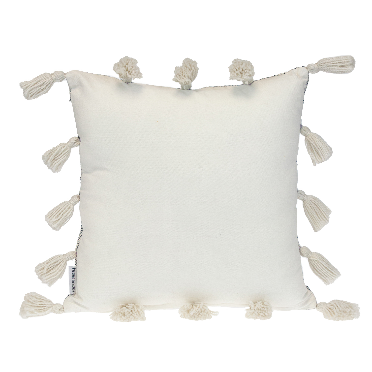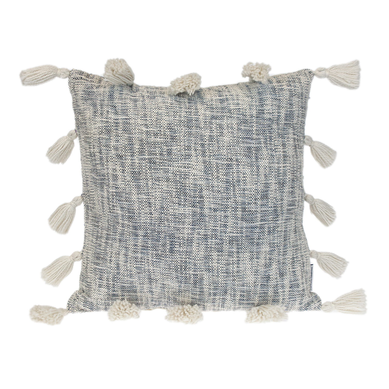 Enhance the look of any space with this pom-pom throw pillow. This blue color and soft woven cotton material match nicely with any patterned or single-colored furnishings. Pom-pom details adorn the sides for a whimsical affect