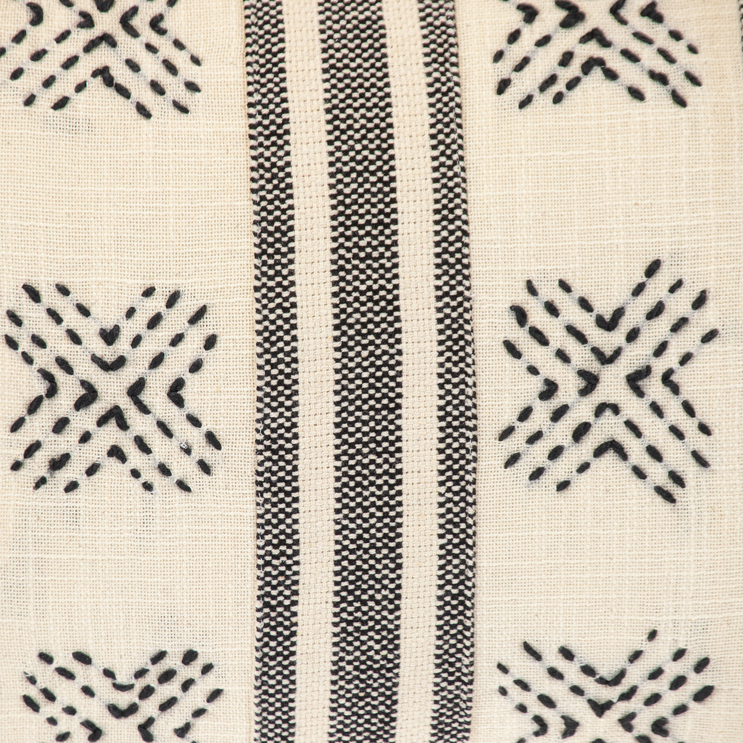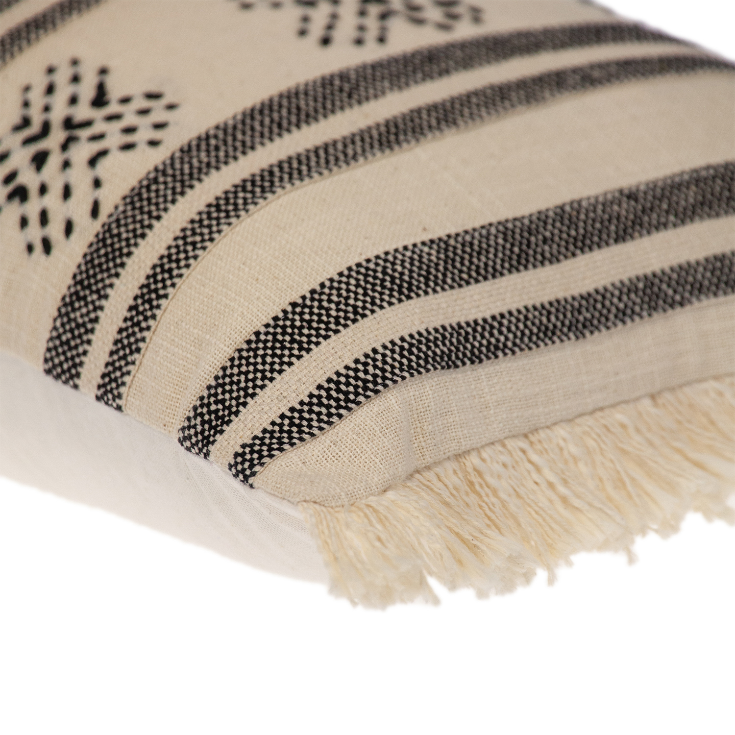 This boho lumbar throw pillow Accents boasts a ton of texture designed to catch the eyes no matter where you toss it. Its front cover is defined by a multi-toned design in black with stripes in neutral beige.