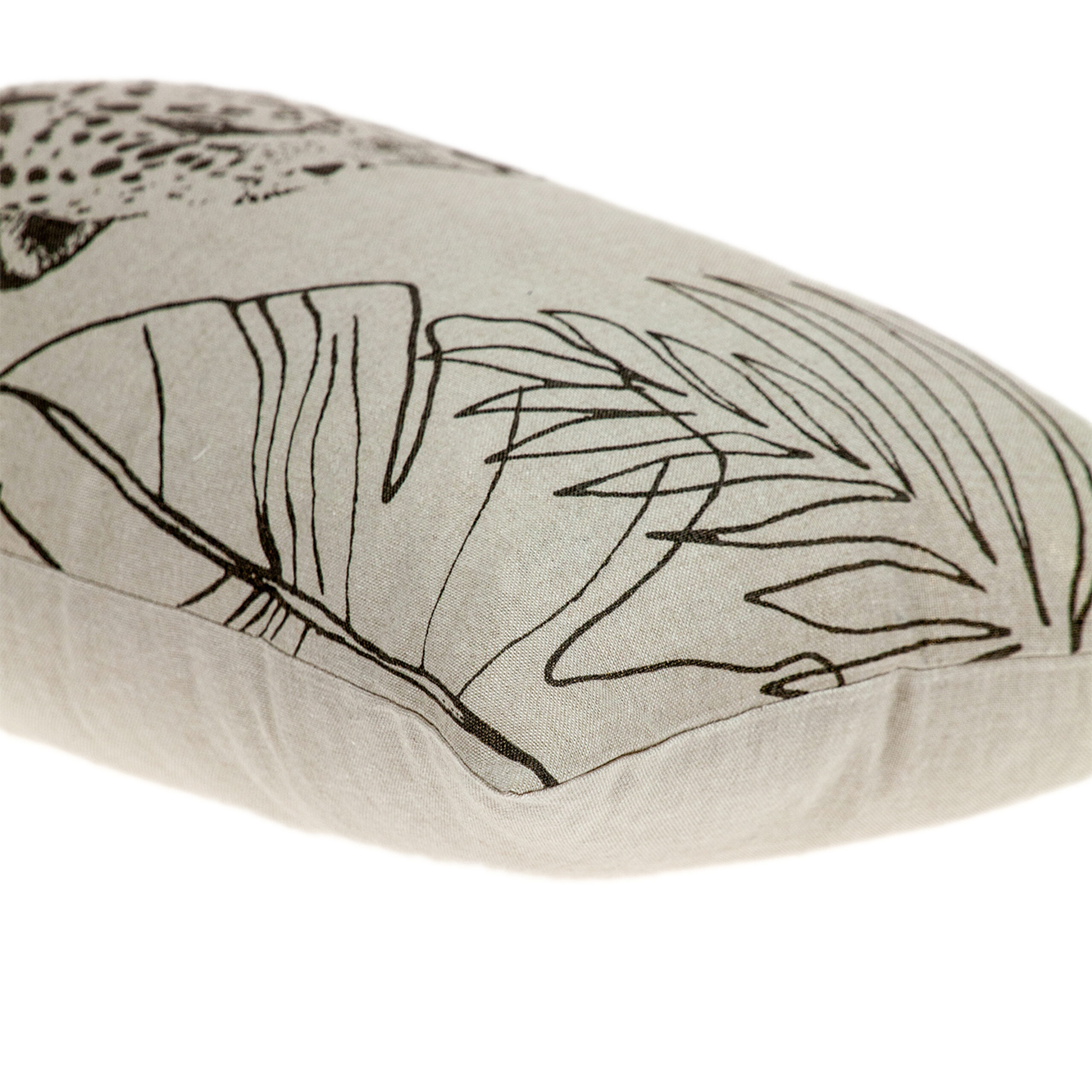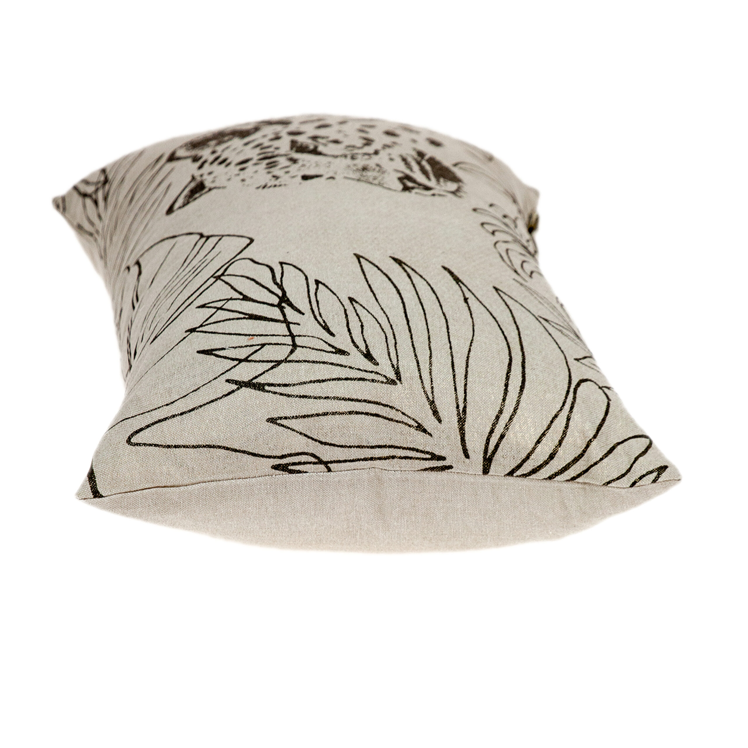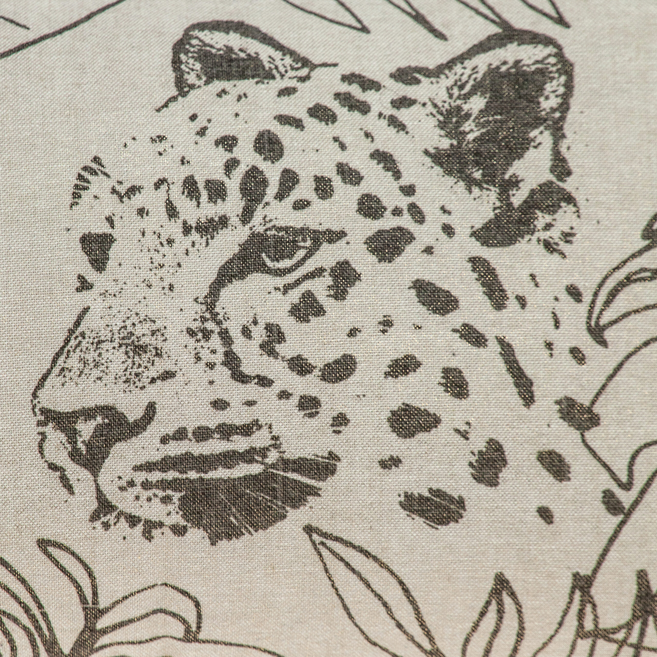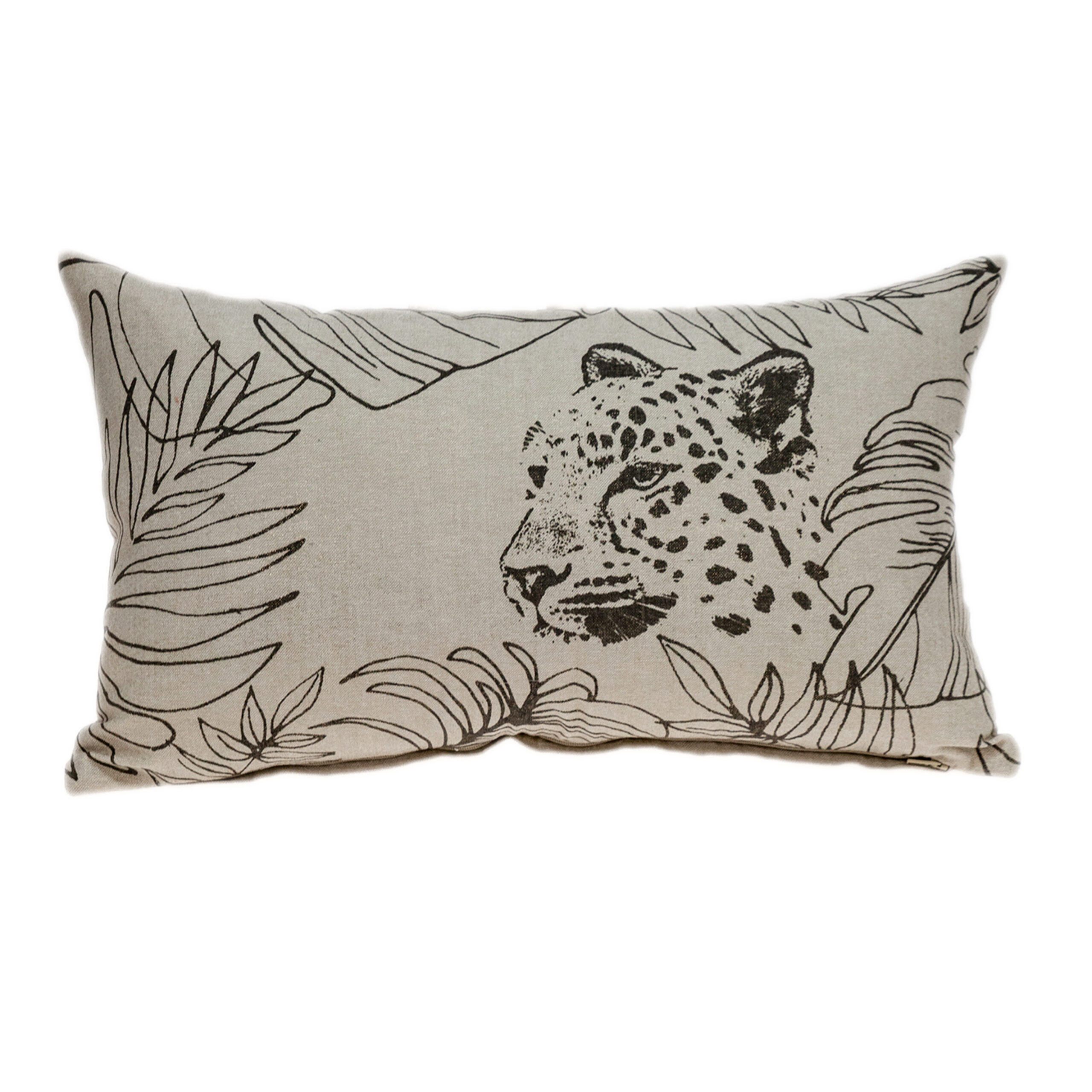 Add this “Jaguar in the jungle” throw pillow featuring printed on 100% Cotton Fabric. Front in panel & gold foil print on beige chambray fabric so you see the subtle shiny gold color through the Beige Fabric.